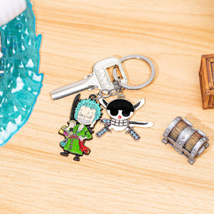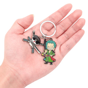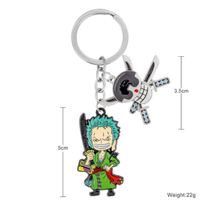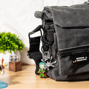 Unleash the warrior spirit of Roronoa Zoro with this keychain featuring him in a powerful stance, ready to strike with his swords. Paired with a charm of his signature jolly roger, this keychain embodies Zoro’s unyielding determination and strength as the Straw Hat crew’s formidable swordsman.