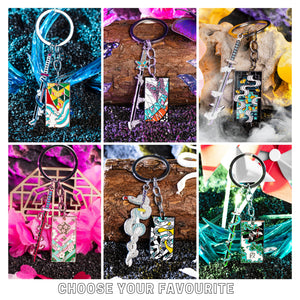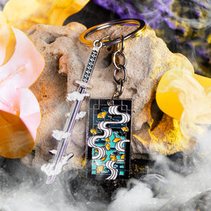 Embrace the serene and ethereal power of Muichiro Tokito with this keychain featuring his iconic Nichirin blade and a charm that reflects his tranquil colors and misty theme. The charm captures the calm and otherworldly presence of the Mist Hashira, with soft, misty hues that mirror Muichiro's quiet strength and focus.