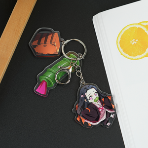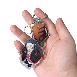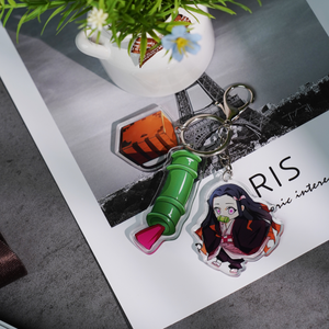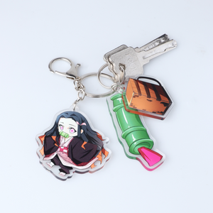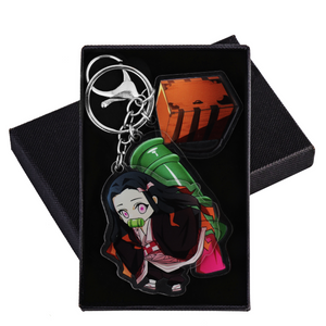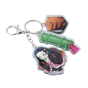 Carry the charm of Nezuko Kamado wherever you go with this acrylic keychain featuring her along with three iconic charms: one of Nezuko herself, one of her travel box, and one of her bamboo muzzle.