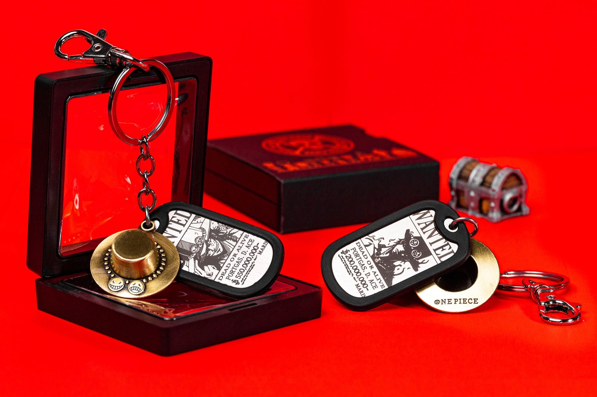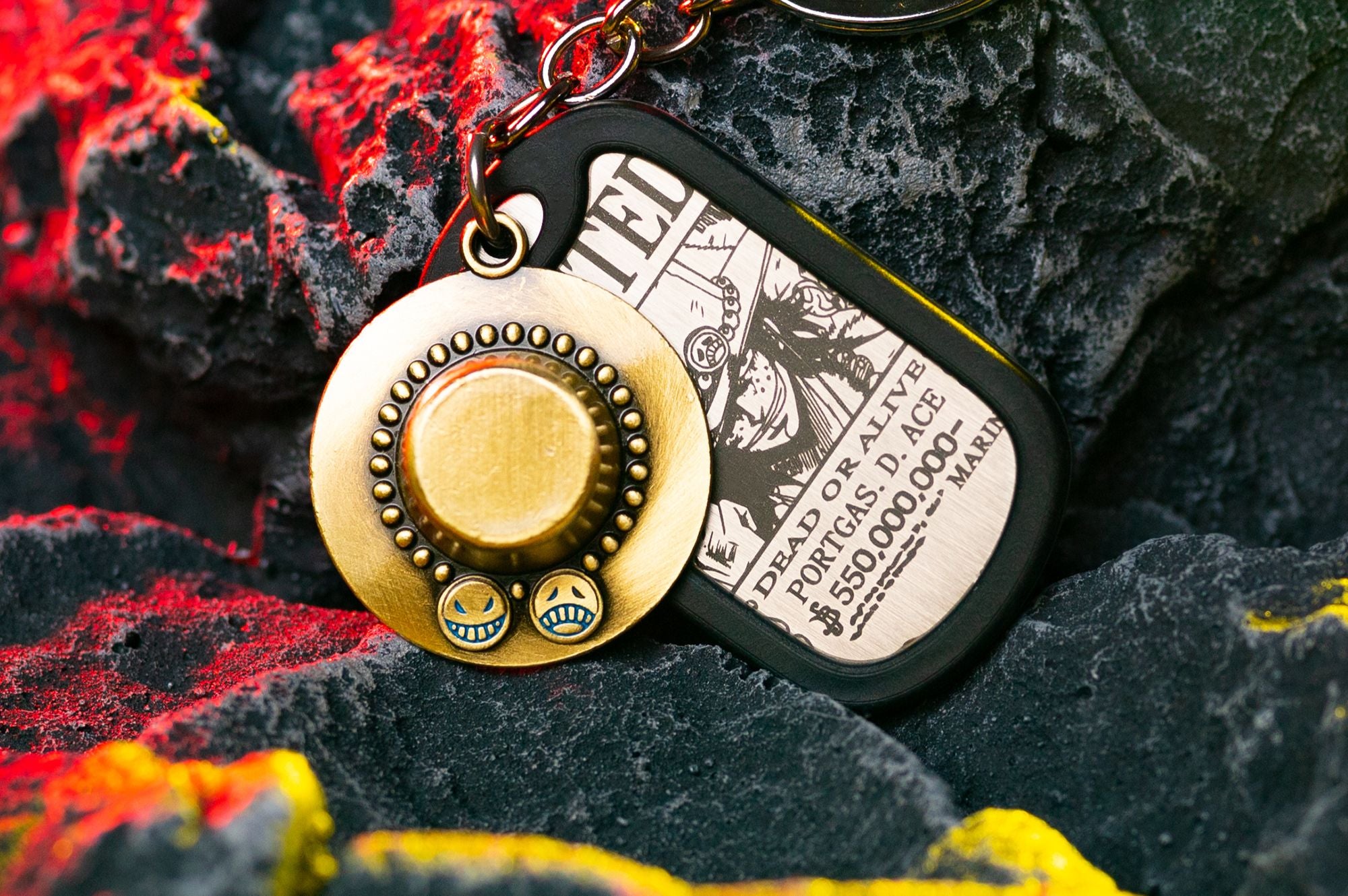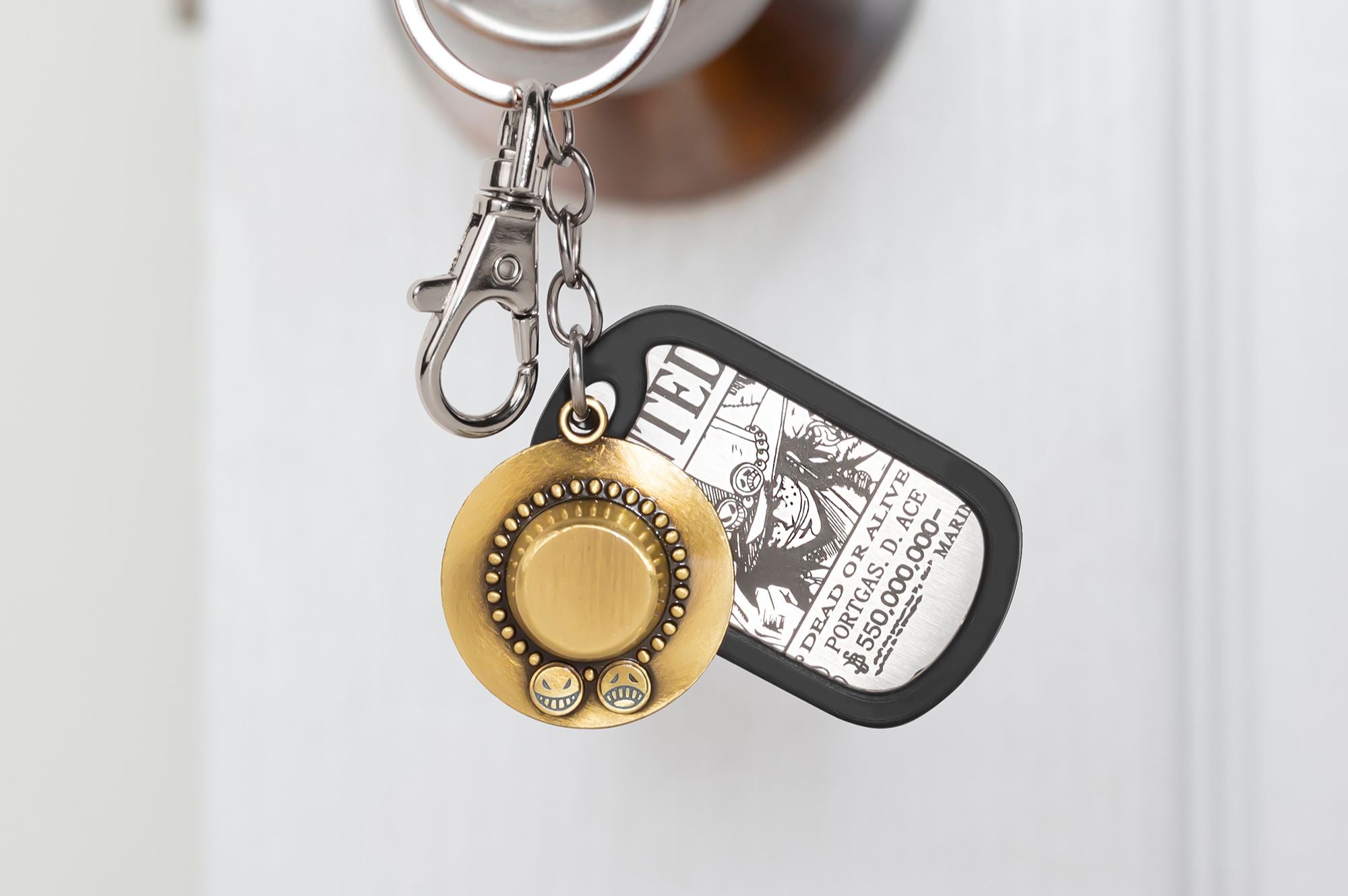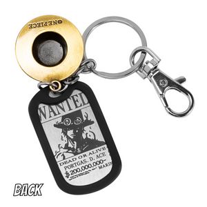 Pay tribute to the legendary Portgas D. Ace with this keychain featuring a dog tag engraved with his iconic wanted poster and a charm of his signature hat. This design captures...