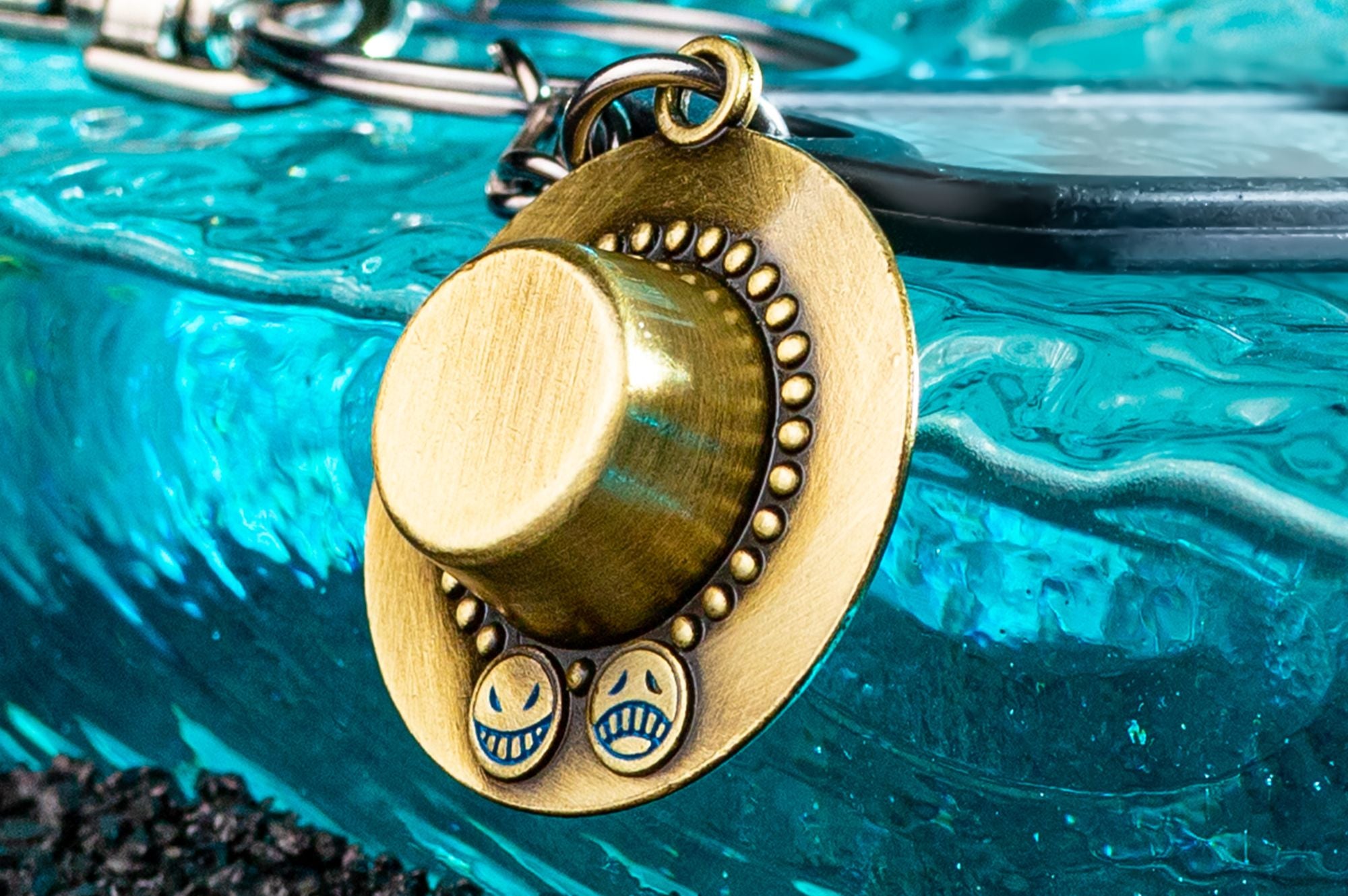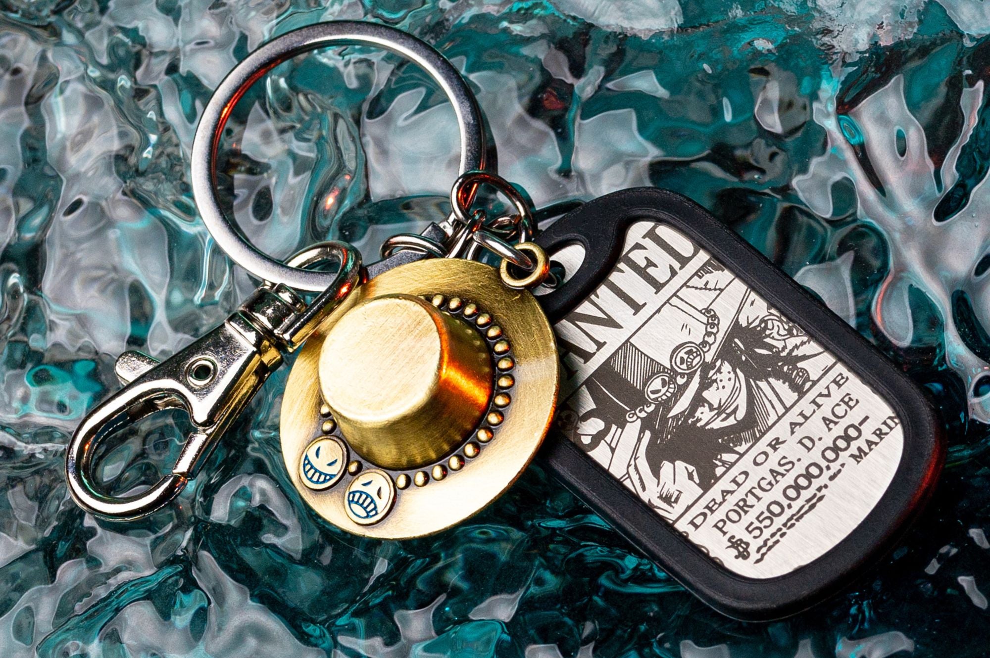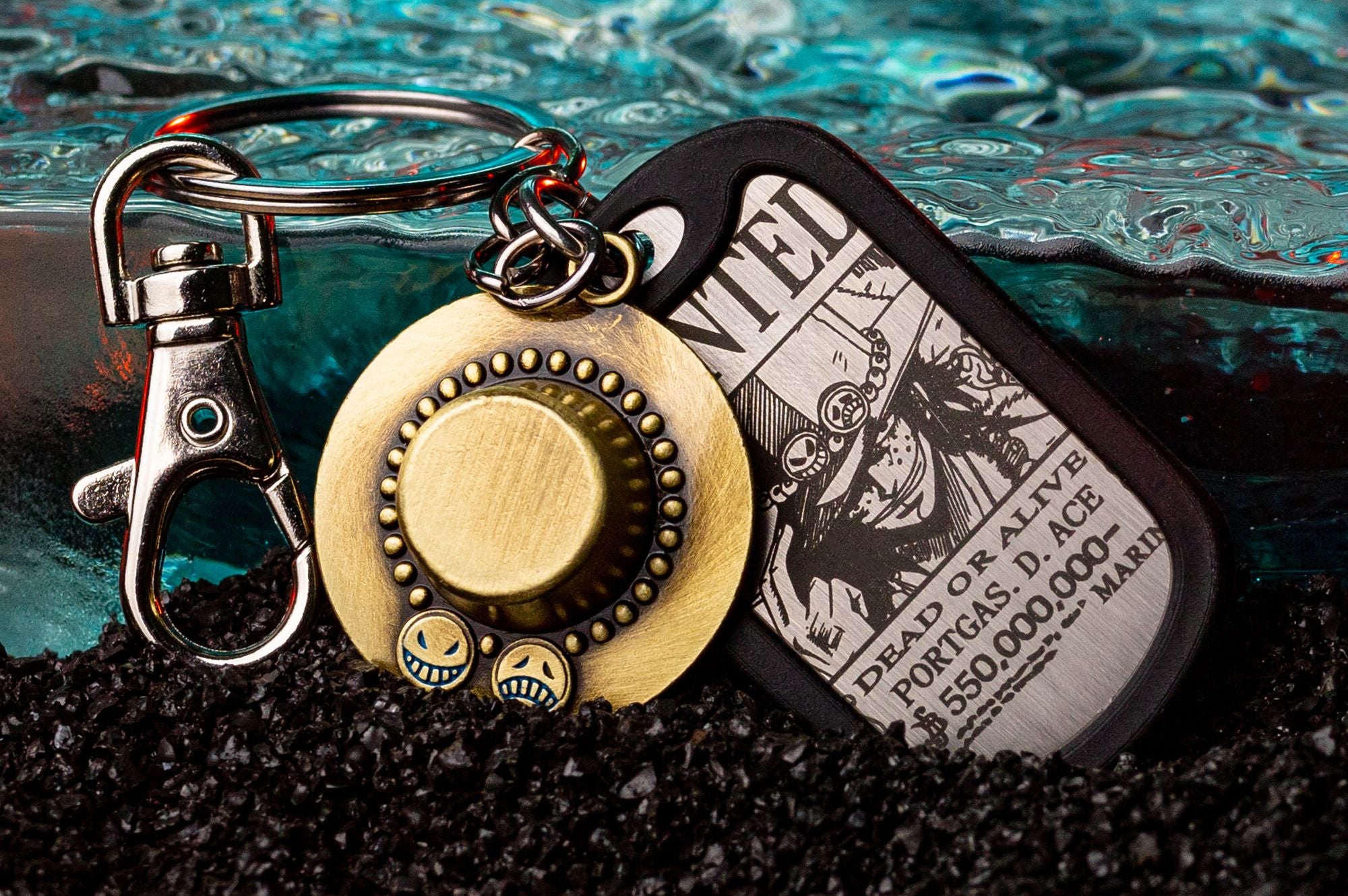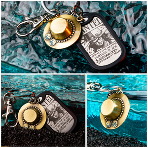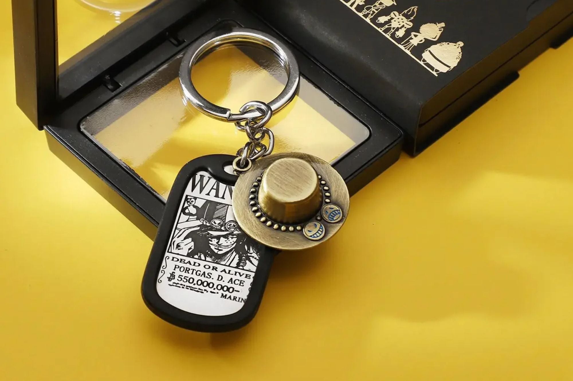 Pay tribute to the legendary Portgas D. Ace with this keychain featuring a dog tag engraved with his iconic wanted poster and a charm of his signature hat. This design captures...