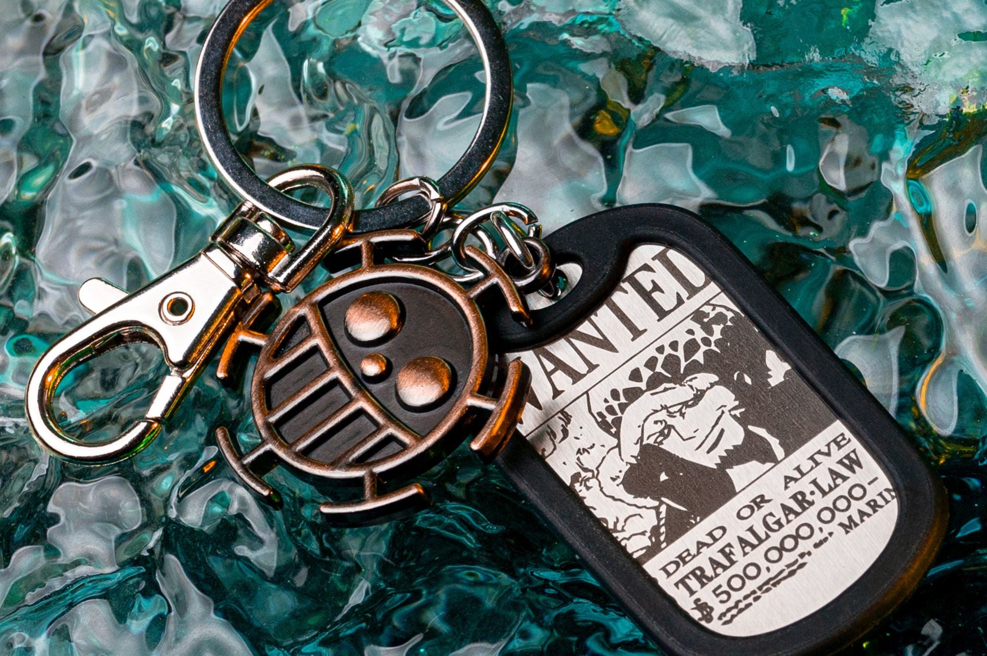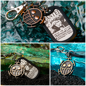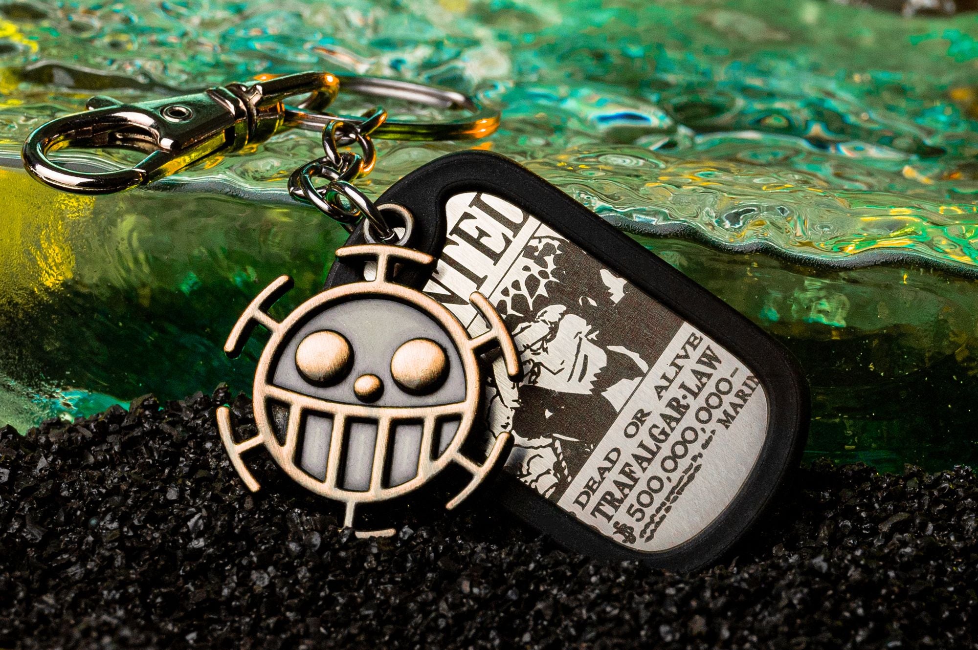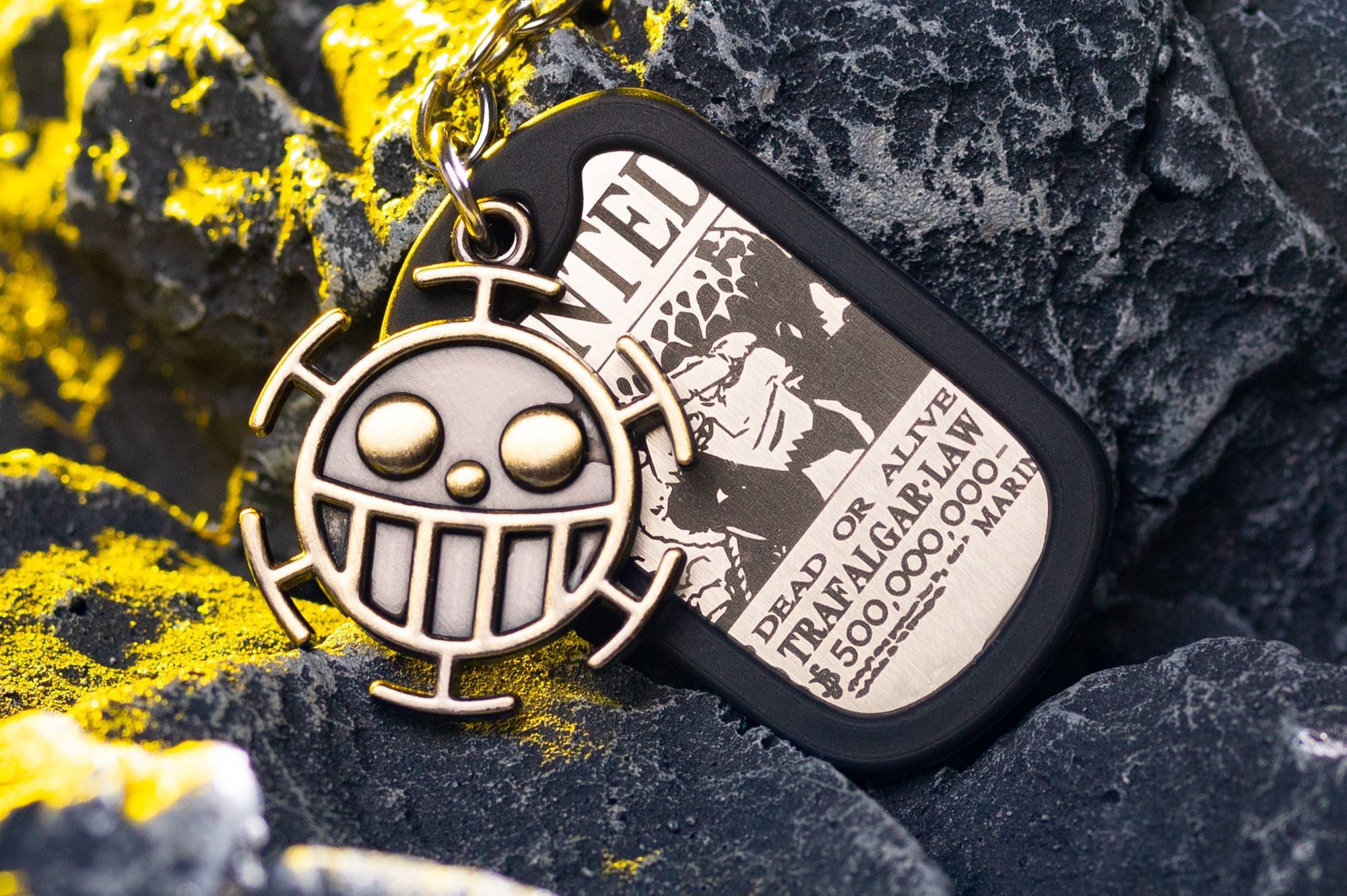 Immerse yourself in Trafalgar Law's cool presence with his bounty of 500 million & 200 million. Etched into a sleek metal dog tag, this piece is accented with Law’s Jolly Roger....