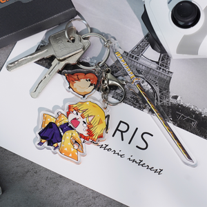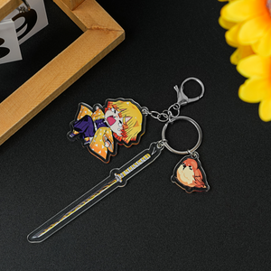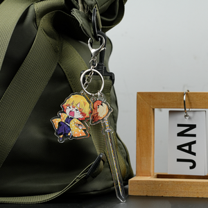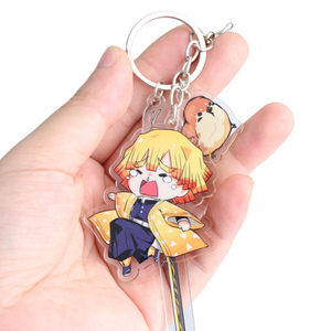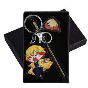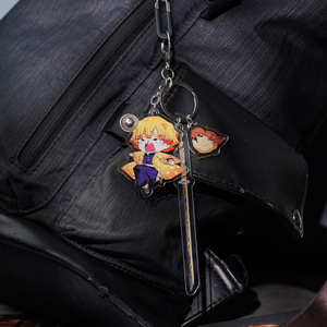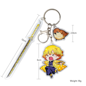 Celebrate the lightning-fast spirit of Zenitsu Agatsuma with this acrylic keychain featuring him along with three distinct charms: one of Zenitsu, one of his Nichirin blade, and one of his beloved sparrow, Chuntaro.