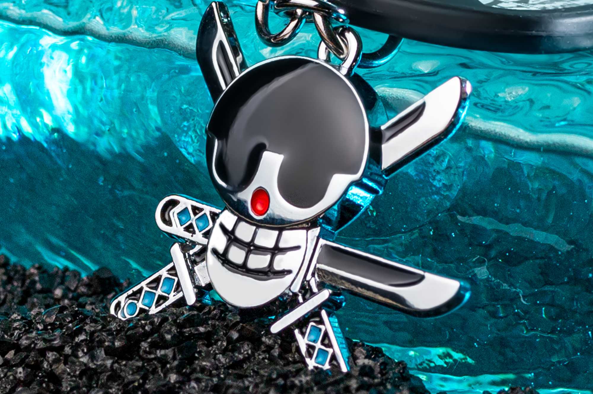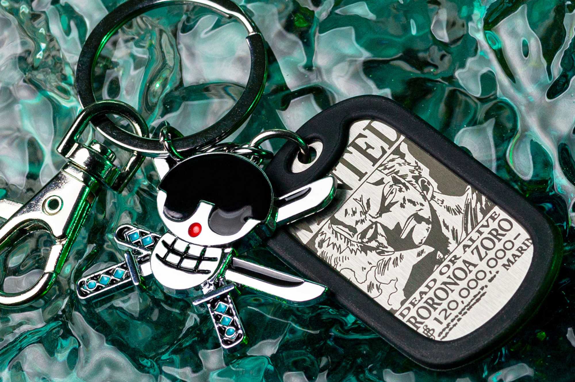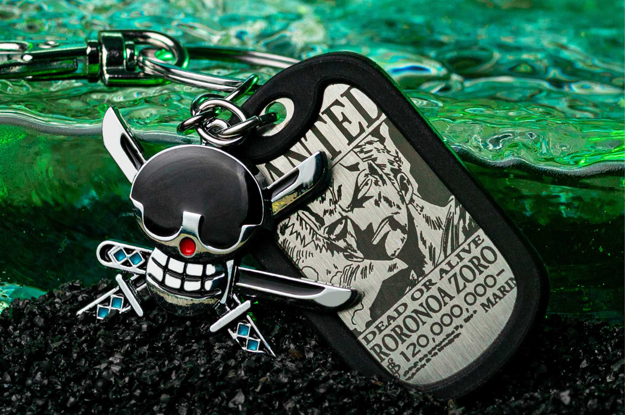 Crafted to capture the thrill of Roronoa Zoro's journey, this keychain flaunts his latest and previous bounties, etched into a sleek metal dog tag with Zoro's signature Jolly Roger Charm.